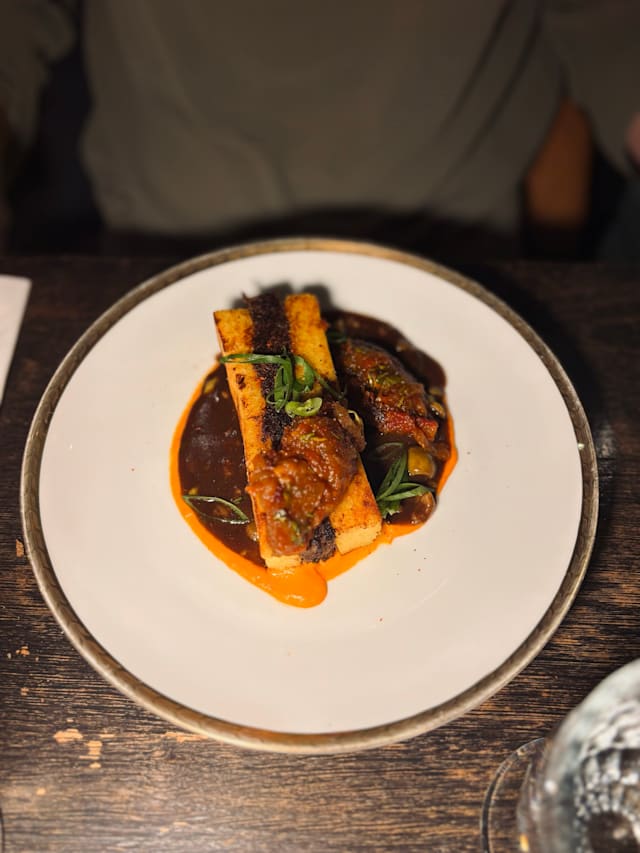 Pressé de polenta et paleron de bœuf braisé, tombée d’oignons aux tomates et herbes fraîches, coulis de poivrons, jus réduit aux olives et basilic.
