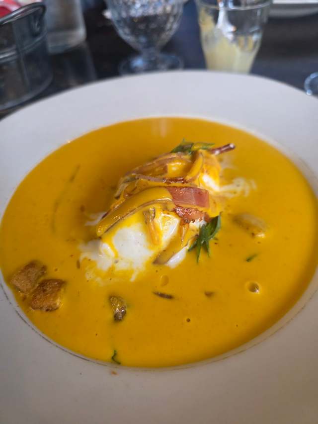 Fin velouté de potimarron et châtaignes confites, julienne de Speck fumé, quenelle de crème fouettée, croûtons dorés.