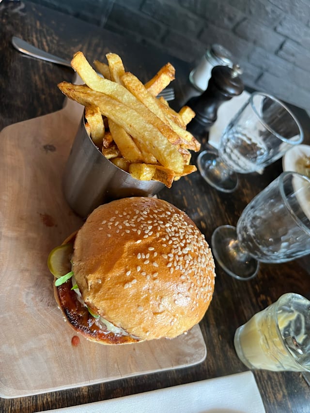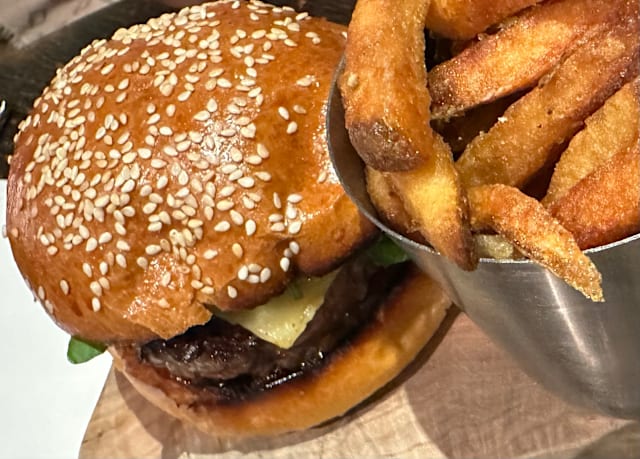 Pain buns de nos boulangers, viande de boeuf snackée (Origine France), compotée d’oignons rouges fumée, Cheddar affiné, sauce barbecue, salade de roquette.