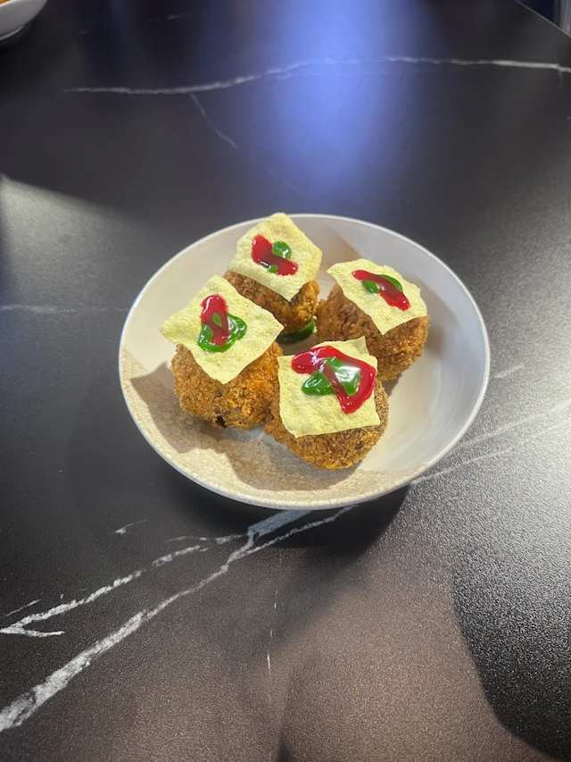 - (Croquetas de sabor pollo al estilo indio con queso fundido)