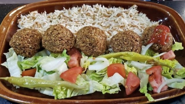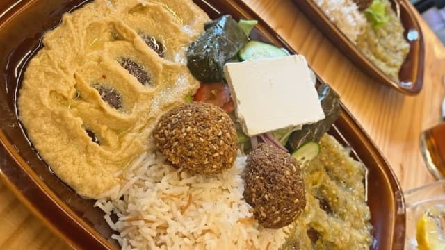 Carne de ternera o pollo, arroz, patatas, hojas de parra rellenas, croquetas de garbanzos, queso, ensalada y salsas