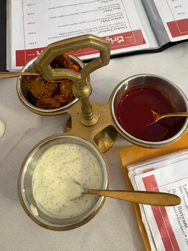 - Pollo, agnello, e gamberi* marinati con diverse salse in yogurt e spezie, cotti nel forno tandoor, serviti con il pane