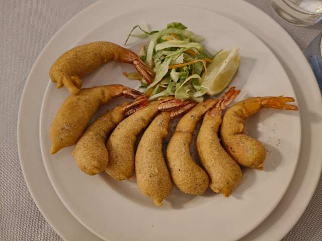 - Gamberetti speziati fritti in pastella di farina di ceci con limone