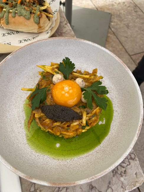 9.5/10This was my second time at Sauvage, and I went hoping to try again the lobster rice I loved so much before. Since it wasn't on the menu this time, Edith from the staff kindly suggested the sea bass rice and, as a starter, the Leitão à Brás. Both were absolutely delicious, full of flavor and beautifully prepared. My friend and I were so happy with the recommendation, and the cocktails were also excellent, perfectly matching the celebration of my pre-birthday. After the meal, we enjoyed the stunning view, which made the experience even more special. Great food, attentive service, and a perfect atmosphere.
