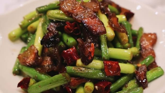 Poitrine de porc sauté aux pousses d'ail