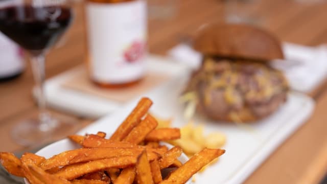 Salsiccia cotta lentamente al bbq affumicata con legno di ciliegio e ripassata in birra, accompagnata da senape al miele, cipolla croccante e patatine fritte.