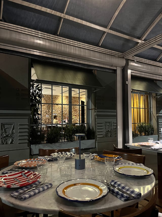 8/10There are two spaces. Inside the restaurant and outside. The outside spot is simple but pleasant. The only negative situation is that people might smoke near you and you probably will eat with the smell of cigarretes! I, personaly, dislike.