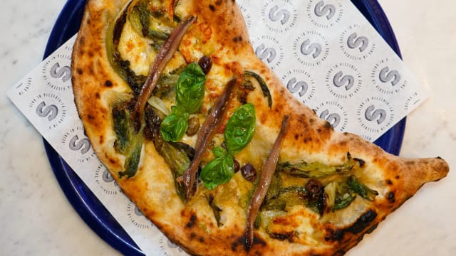 Fior di latte, fiori di zucca, acciughe de mediterraneo, olive taggiasche, zest di limone e pepe nero