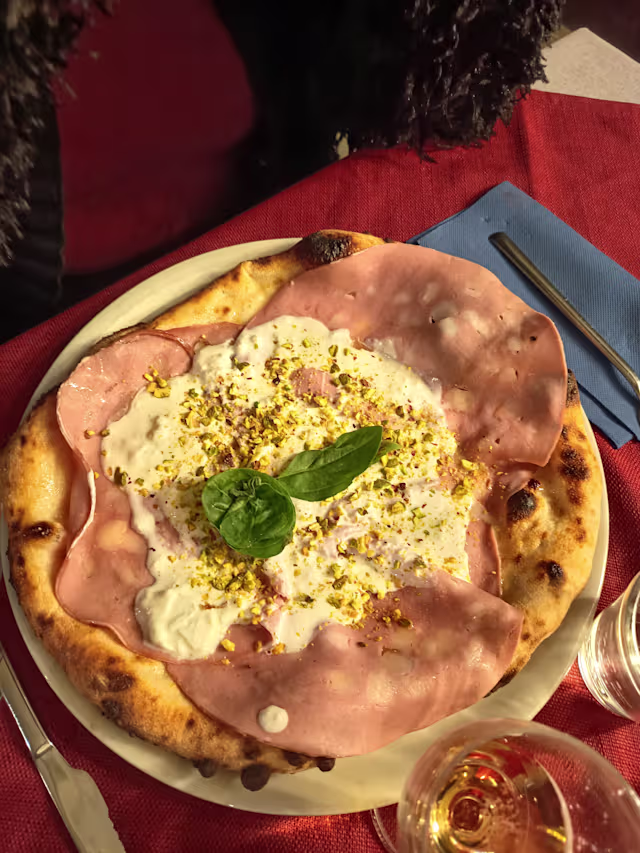 - Fagottino di pizza fritta, burrata, mortadella, granella di pistacchio, crema di quattro formaggi