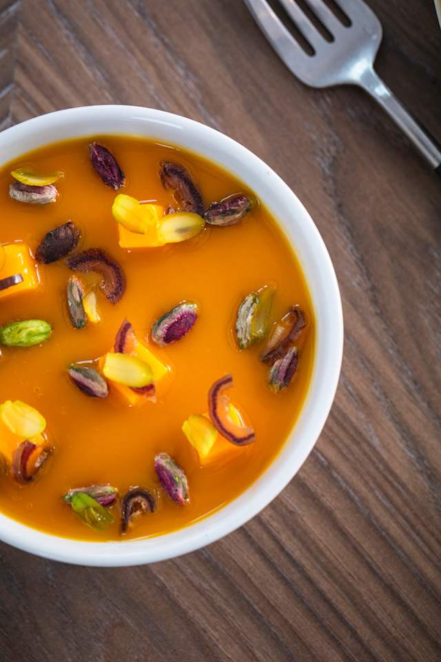 - Parfait glacé, pistache et fleur d’oranger, une touche de mangue.