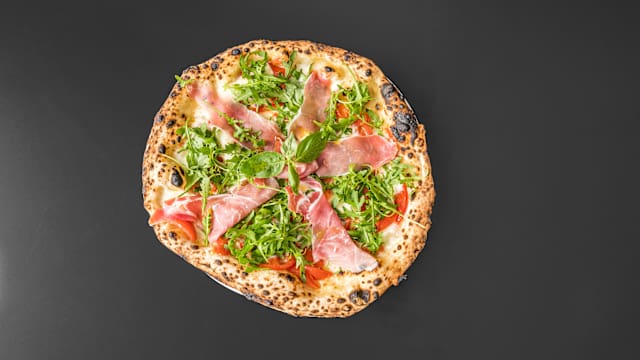 - Sauce tomate, provola fumée,stracciatella, tomate cerises, poivre noir, huile d’olive bio, et basilic bio de naples