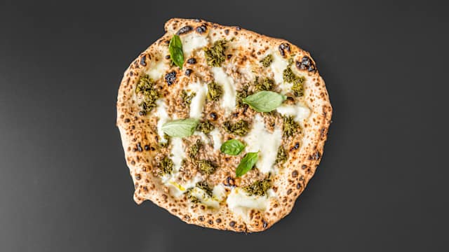 - Sauce tomate, mozzarella, oignon rouge de tropea, filets de thon à l’huile d’olive, olives de gaeta, huile d’olive bio, origan et basilic bio de naples