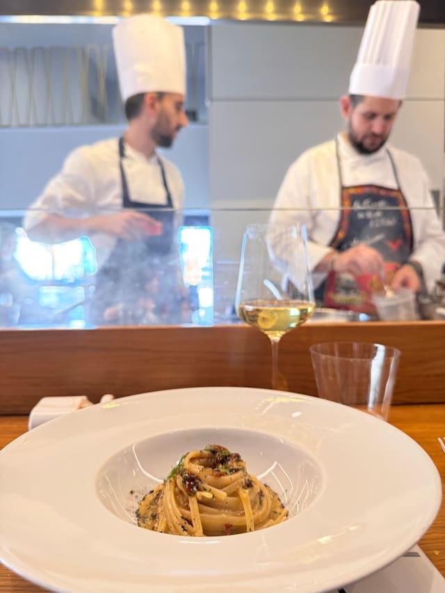 10/10Just outside of Napoli's Marina, the Sea Front Pasta Bar was an amazing experience. Close to the Castel Nuovo, it was a bit difficult to find, as it is above a pasta store called, Di Martino. When you walk into Di Martino with your reservation, they call upstairs and then point you the way. When you walk in, it is a relatively small space situated like a sushi restaurant with an L shaped table, and the cooks behind glass. There are 2 tables by windows. This restaurant is made for pasta lovers. The 3 chefs are right there in front of you cooking your and other customers dishes. It is really an experience to watch their love and care go into every dish. I had the risotto with italian sausage and my wife the pasta with braised beef. Both were delicious. You also get breads and a welcome appetizer. The deserts were sublime. And the Service? Unbelievable. They were so attentive, friendly, and seemed to love their work. 10/10 easily!
