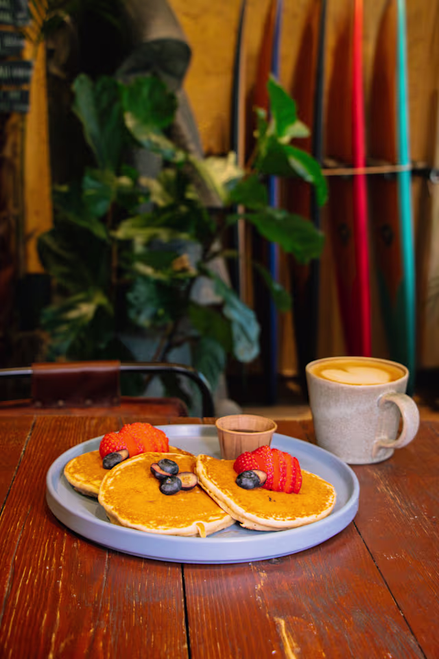 - Pancake proteico de avena, sirope de arce, frutas de temporada y frutos del bosque
