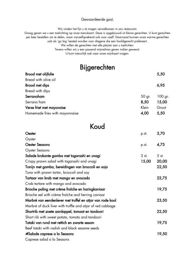Met de prachtige tuin aan de achterzijde en gezellig terras aan de voorzijde is Seasons van alle gemakken voorzien. Bij binnenkomst in het restaurant ervaart u direct de royale mogelijkheden van Seasons; tafelen in ongedwongen sfeer, ontspannen een drankje nuttigen aan de gezellige bar of genieten v...