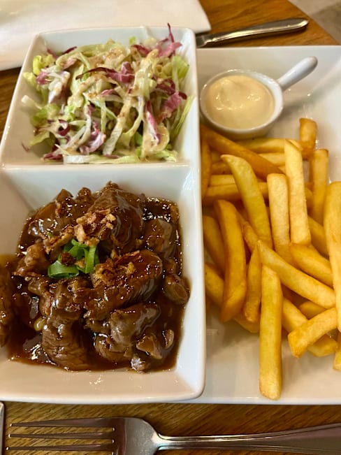 10/10Great food. Service was excellent. A lively atmosphere but not so loud that it interfered with conversation. We both had the lamb chop, which were done medium rare just as we ordered. The other couple had the teriyaki beef. The pris frixe three course meal is a bargain.