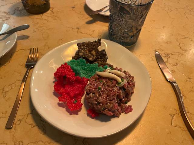 - Veal Tartare, Shimeji de Pickles and Crispy Tapioca Trio