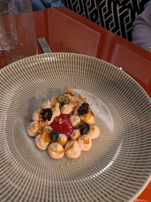 - Mousse al lime, crema aromatizzata al habanero, biscotto al cocco e gel al mango