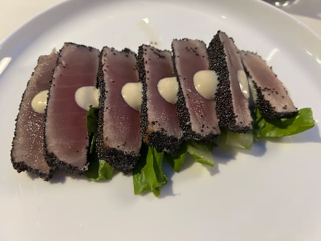 8/10The restaurant and hotel are a surprise in the middle of the old city of Perugia. The menu will satisfy all palettes. I had the house antipastio which was a dish in itself, had tuna taraki( perfect) and ice cream with fresh red fruits ( I was expecting real fruits but got like a coulis of red fruits. Wines ranges from 20 to beyond 100 € the bottle. I drank a rose wine (30€) very nice ) which i found expensive nevertheless there was a singer/ guitarist tonight . Nice but not my cup of tea . In the whole a very pleasant discovery
