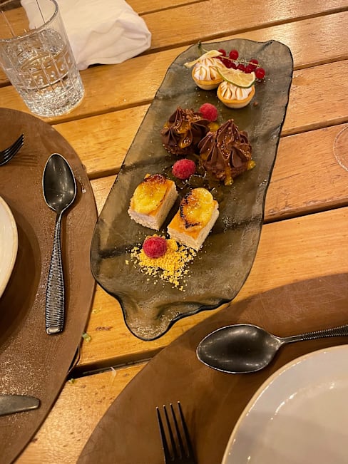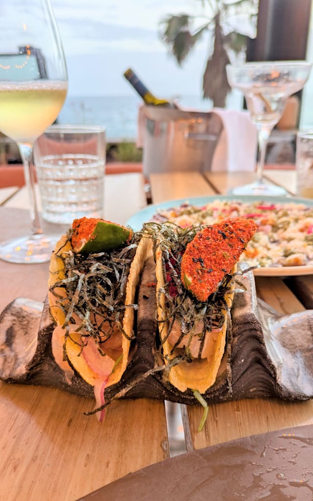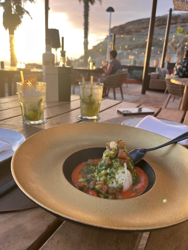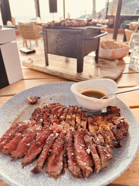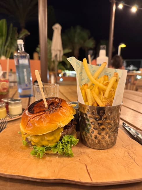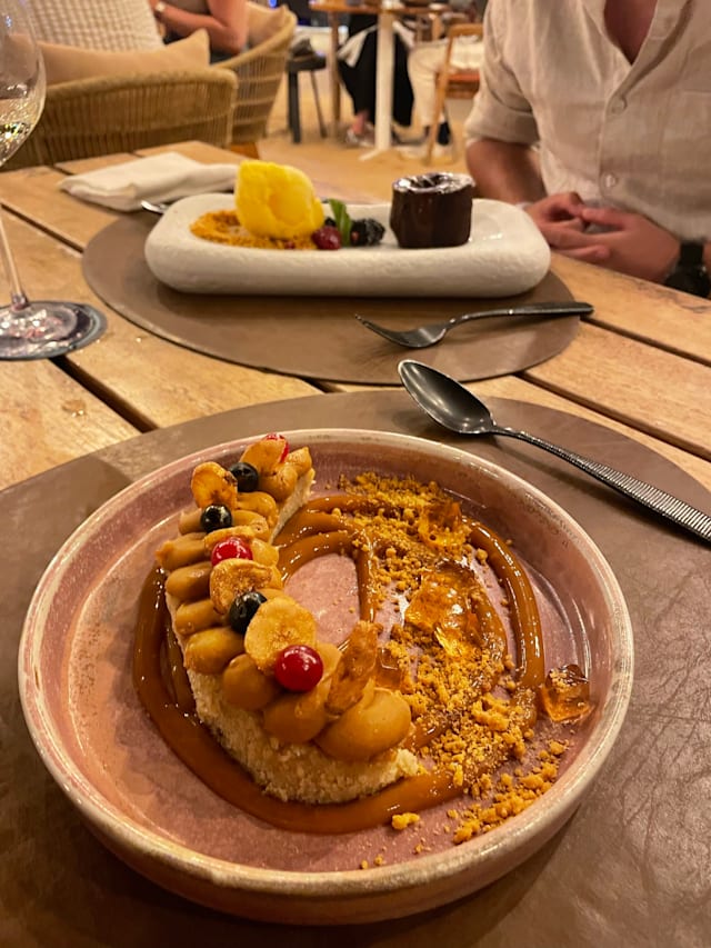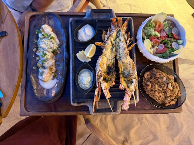 9/10The setting was beautiful, with a great view of the ocean, though I wasn’t a fan of the sand. We started with burrata, which I found a bit too firm and lacking creaminess, though the sauce was excellent. For the main course, we had a local fish that was grilled perfectly, but the server struggled a bit with filleting it. Dessert was outstanding. Overall, the quality was good, but the prices—especially for drinks—felt a bit too high.