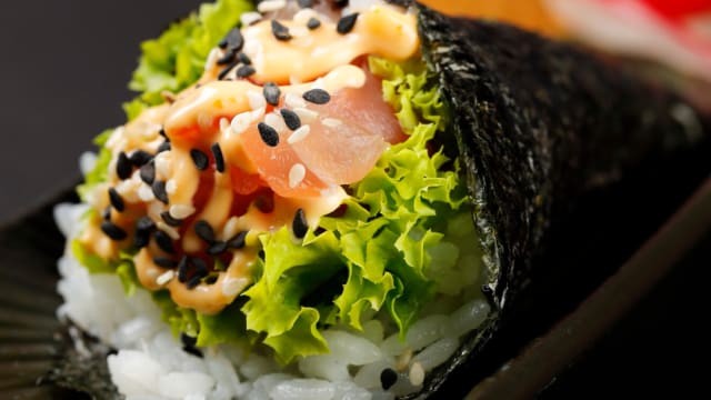 Base di riso con misto pesce, alghe, insalata, sesamo