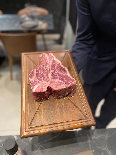 All our beef are shown before being cooked for two reasons: 1) to point out to the customer the quality of the meat through its most important characteristics (marbling and days dry aged) visible to the naked eye by the colour and quantity of fat. If the quality did not convince her she could tell us or choose something else from the menu 2) communicate the weight: if it seemed too small she could replace it with a larger one. The sides are not to be shared.
