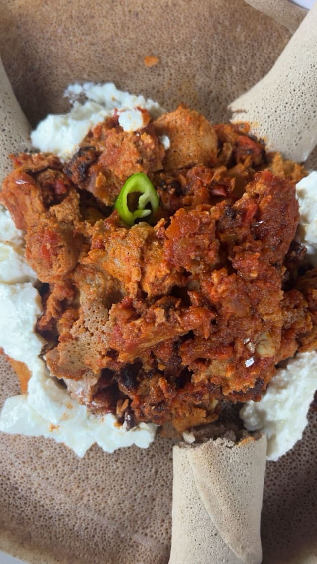 (Bœuf en sauce) lanières de bœuf sauce mijotée assaisonnée de berbére avec ou sans piment, accompagnées d'injera.