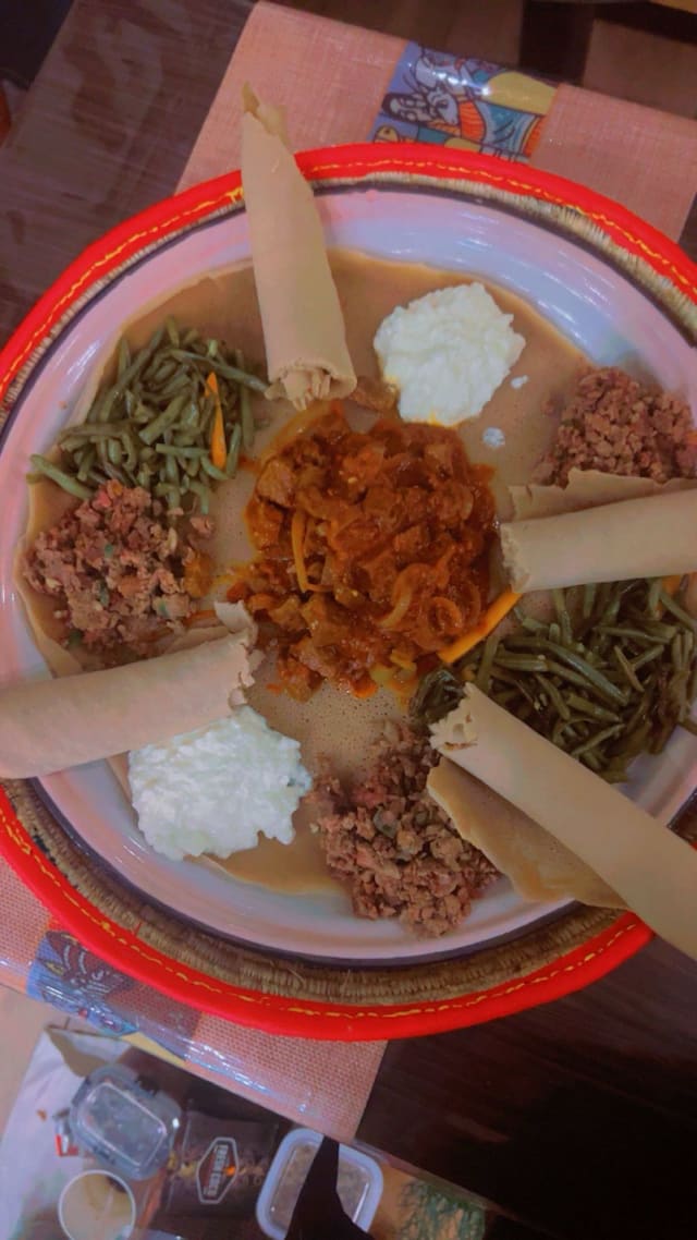 (Grillade de bœuf) grillade de beuf aux piments verts, oignons, épices, légumesaccompaanée de accompagnée de salade et d'injera.