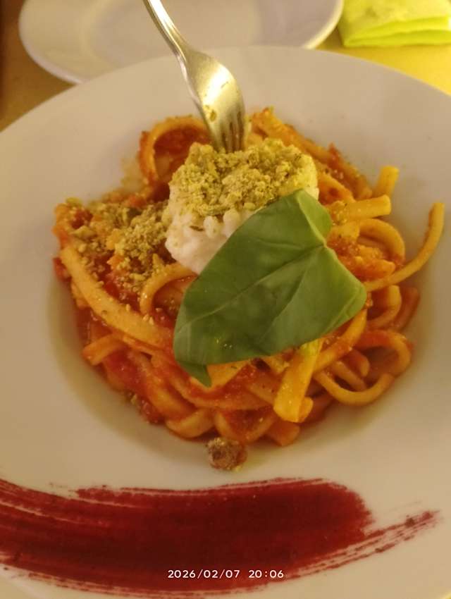 - Scialatielli con Pomodoro Fresco, Basilico, Stracchino veg homemade e Granella di Pistacchi di Bronte
