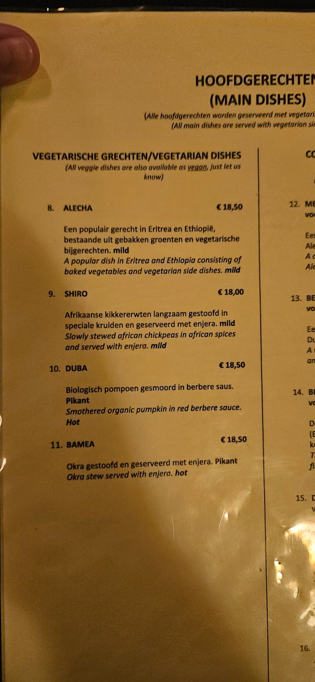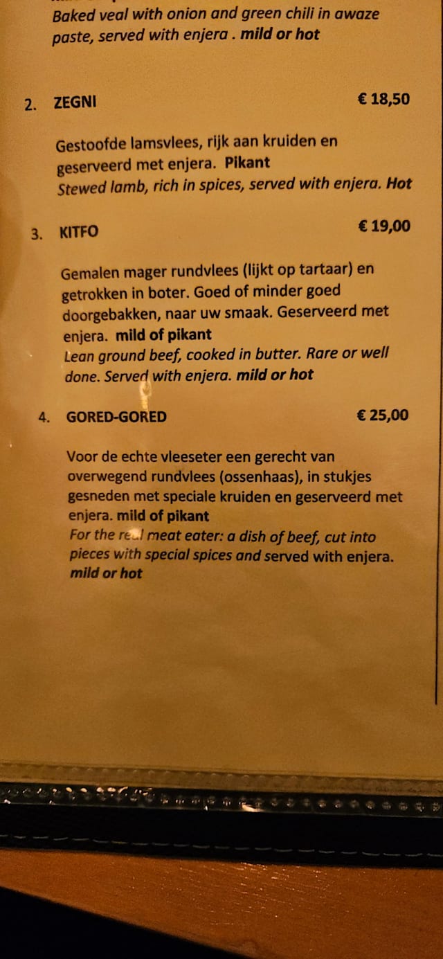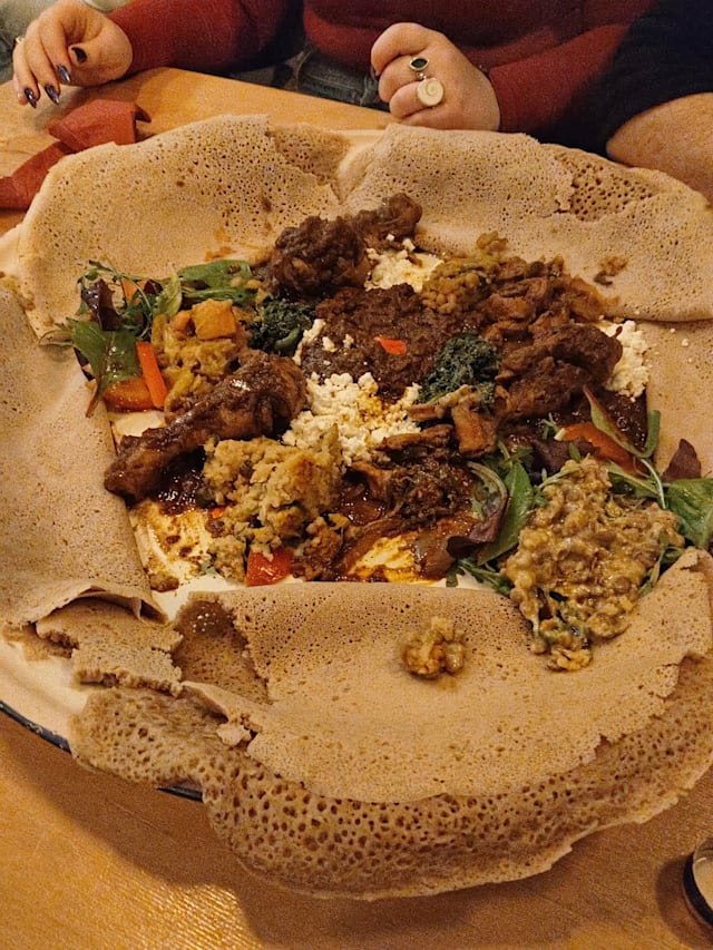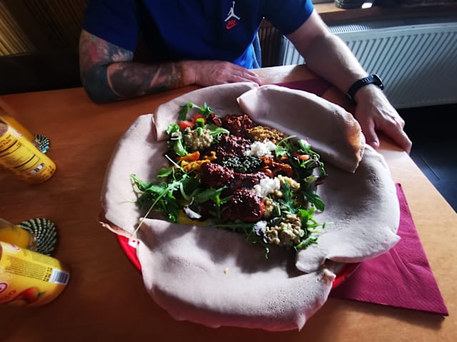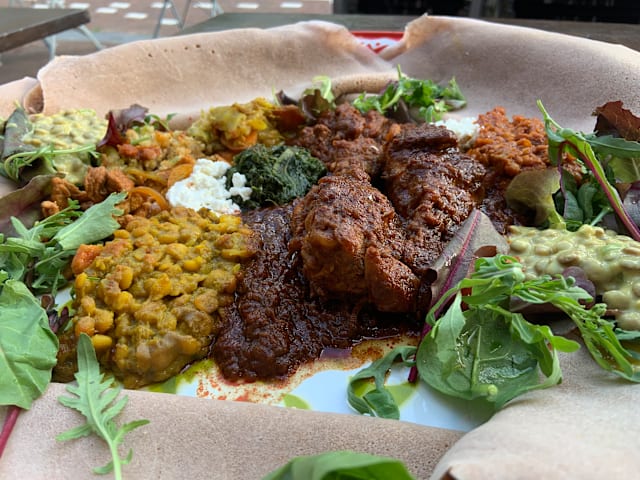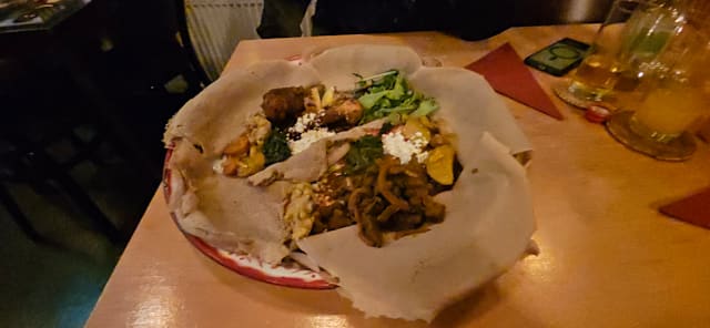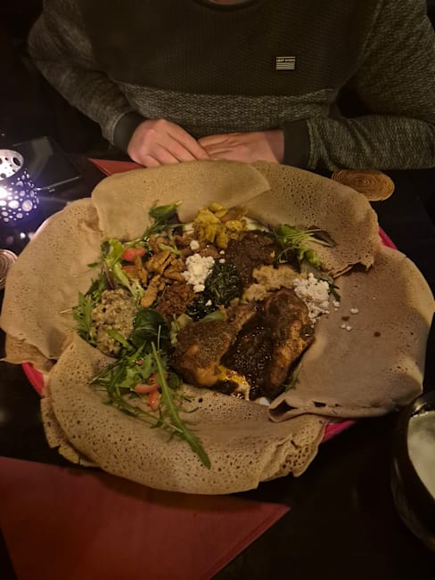 9/10I have been to about five Ethiopean/Eritrean restaurants before and I always enjoy them. The dishes are varied and the way to eat with the sour dough crêpes is a nice change to our conventional eating. This restaurant was very good and I can definitely recommend it. The only thing I was not delighted by was that in the non-meat version there was only a single spicy sauce... the famous spicy egg does not come in a vegeratian version.
