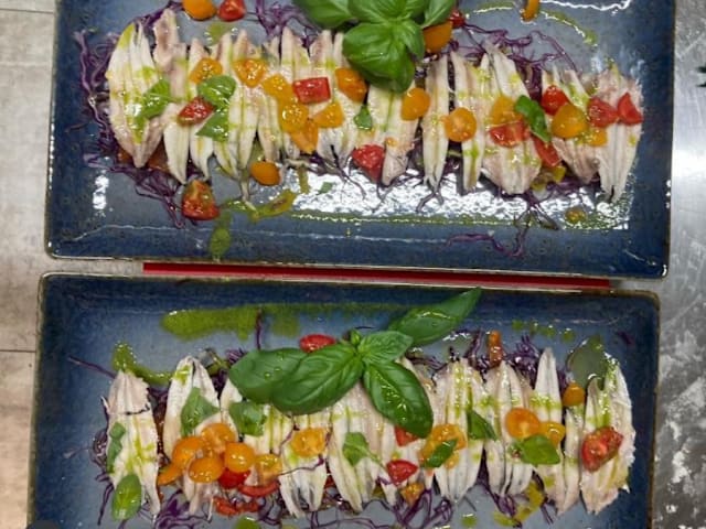 Fusiuone mancini con totanetti scottati pachino e taggiasche