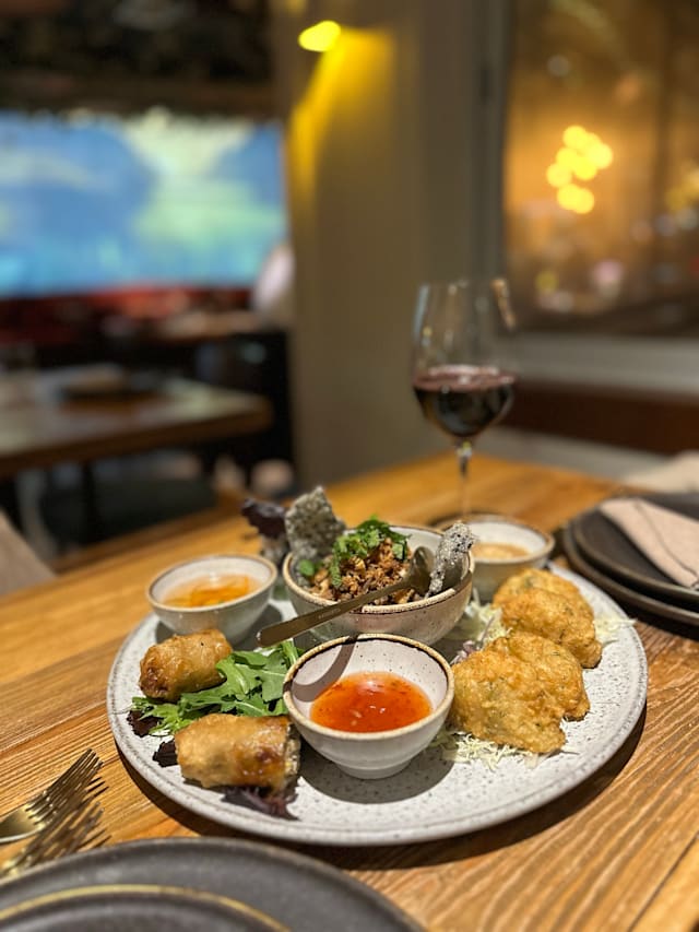 Sortido de entradas com rolinhos de verão, rolinhos de primavera, pataniscas de choco e salada do chef.