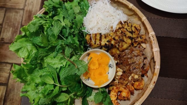 Porco ibérico grelhado marinado à moda de hanoi com massa vermicelli de arroz, salada e molho de peixe.