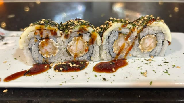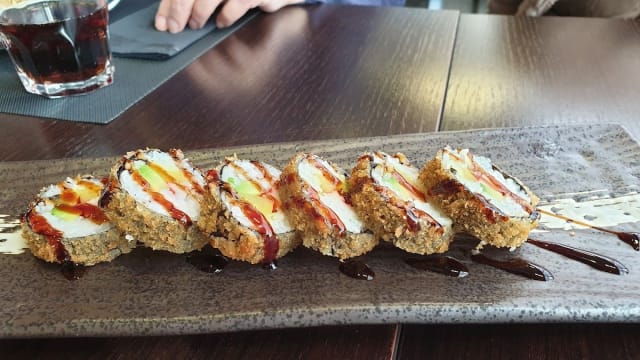 Gambero fritto, avocado, ricoperto con tartare di salmone scottato, rucola fritta, salsa rucola e teriyaki