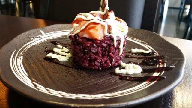 Salmone fritto, avocado, maionese, grana di pecora, salsa teriyaki e tartufo