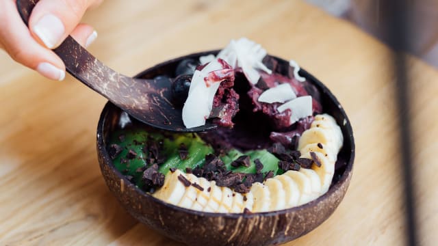 Frozen organic açaí with fresh fruits of your choice, topped with banana, granola, almond flakes, served in a coconut bowl. Extra peanut butter +1,50.