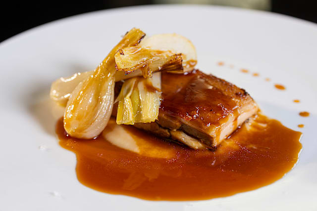 Maialino porchettato cotto a bassa temperatura, cipollotti e crema di mele acide