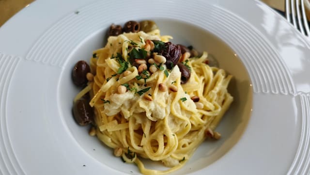 Tagliolini al baccalà mantecato olive taggiasche e pinoli