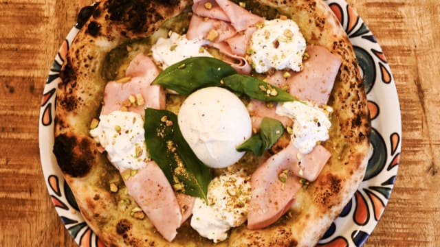 Sauce pesto pistache, mozzarella fior di latte, à la sortie mortadelle, straciatella, éclats de pistache