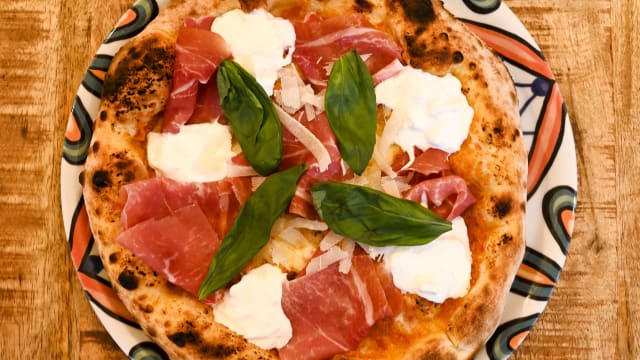Sauce tomate san marzano, mozzarella di bufala, jambon de parme 24 mois, tomates cerise, huile d’olive