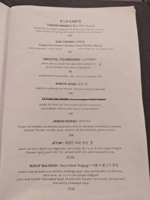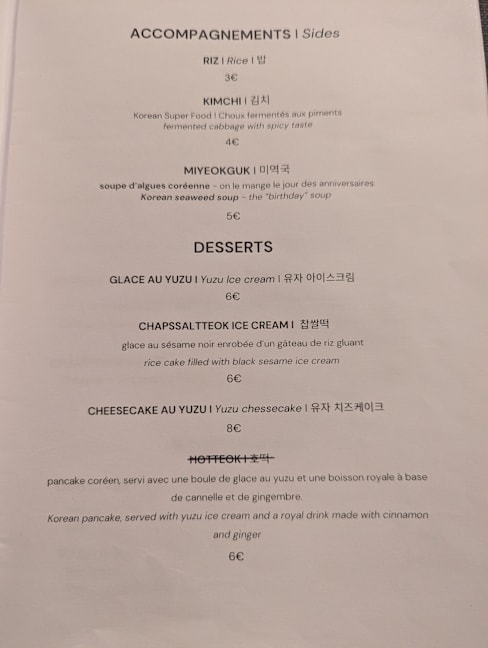10/10+2One of Paris little secrets this excellent Korean restaurant. We discovered it when stayed at the hotel les Jardins du Marais which is opposite. The hotel doesn’t do evening meals and this restaurant amply filled the gap. A concise menu gave enough choices and we weren’t disappointed. The dak twigim (fried chicken ) and Kimchi Jeon (kimichi pancake) the highlights. The price for 3 courses plus a drink was about £30 and very good value. They even do takeaway which we used one evening after a long day out in Paris. The service was excellent from a friendly and attentive staff. A must visit place for Korean food. We have just visited again in September and the food is still amazing.