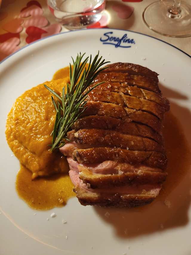 - Petto d’anatra, fondo bruno, purè di zucca e cipolle