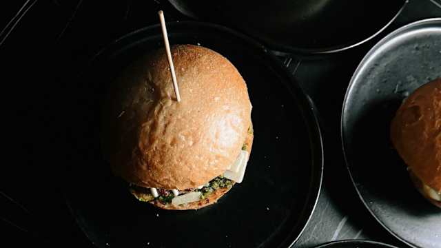 - Bun americano, hamburger di manzetta 180g, mortadella, pesto di pistacchio, primo sale