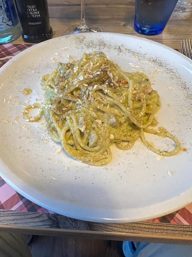 Spaghetti di grano macinato a pietra con pesce affumicato, seppia, uovo e cipollina croccante
