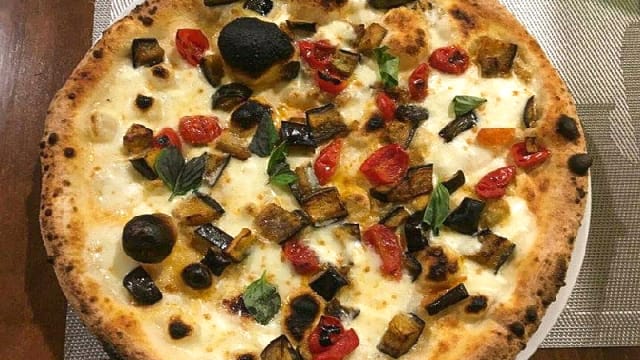 Ombra di pomodoro, prosciutto cotto, melanzane a funghetto, mozzarella di bufala affumicata e basilico