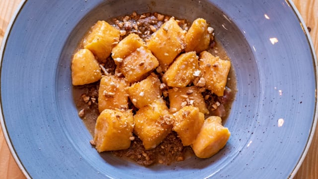 - Homemade Gnocchi with wild boar ragù, homemade tomato sauce, lard and cashew