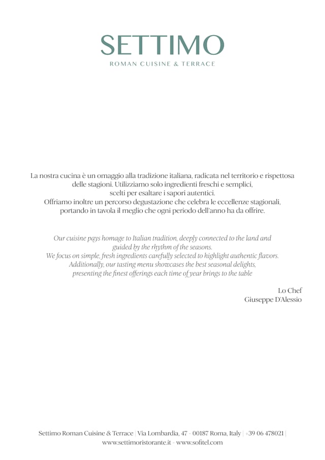 10/10We arrived at settimo last night for a meal and was treated exceptionally from start to finish. We ordered the truffle carbonara and the beef filet with pumpkin and mushroom and were blown away with the flavours! Hands down the best meal we have ever had, so good that we had to order another main just to see what else they had to offer. We shared the tortellini cacao filled with beef stew. And finished it all off with some green apple/ lemon / strawberry sorbet and a tiramisu. 100/10 would highly recommend for a romantic dinner with stunning skyline of Rome and sunset views.