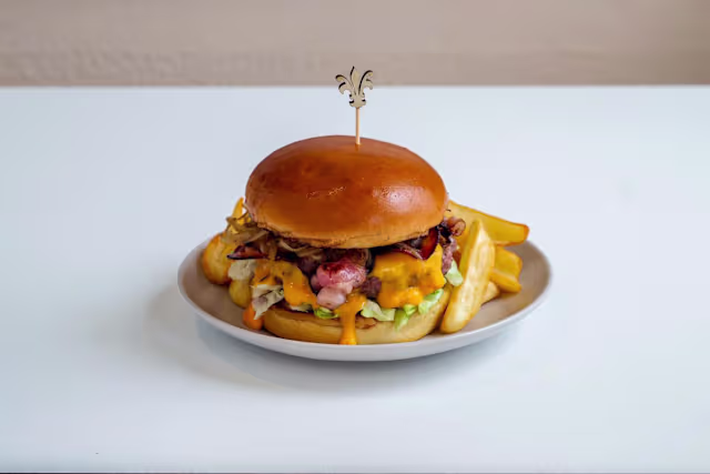 - Pão, molho BBQ, molho da casa, carne artesanal, queijo cheddar, bacon, cebola caramelizada, alface, tomate e batata frita.