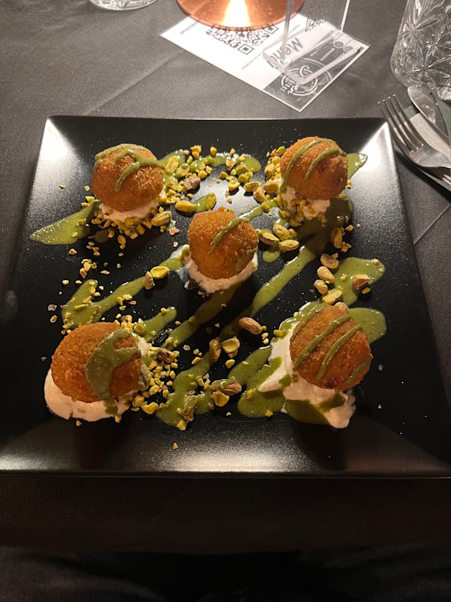 Polpetta di carne con pasta kataifi, maionese al bergamotto e frutto della passione; polpetta di carne con crema di cavolo viola, pomodoro disidratato e fili di peperoncino; polpetta di carne con crema di pecorino e confettura di cipolle; polpetta di carne con stracciatella, crema di pistacchio e gr