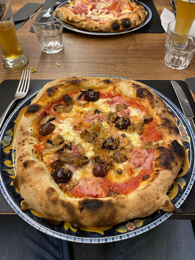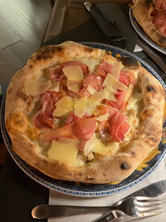 Pancetta di maialino aspromontano cotta alla birra a bassa temperatura e pastellata con fiocchi di mais, riccia, stracciatella,, mousse di pecorino calabrese al pepe nero, chips di patate rosa, guanciale croccante e scaglie di cacio cavallo in grotta silano